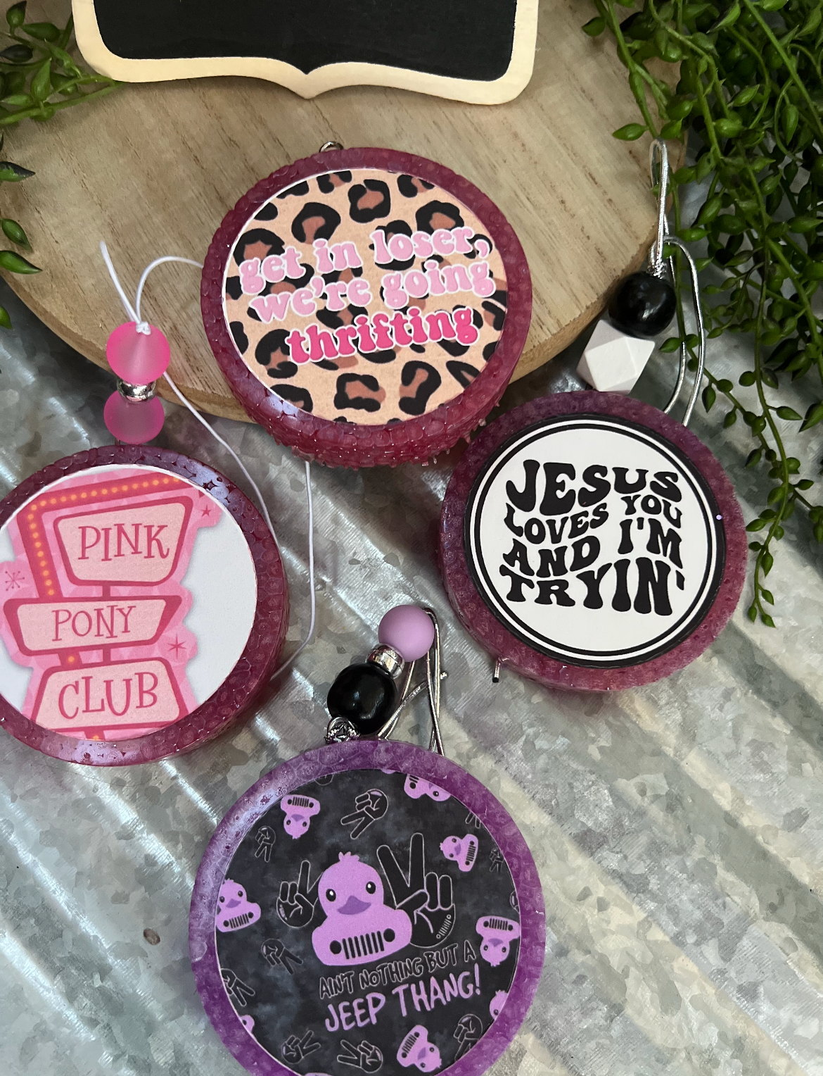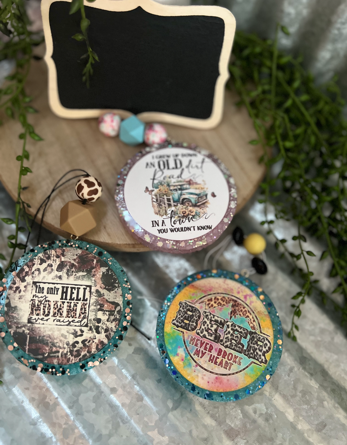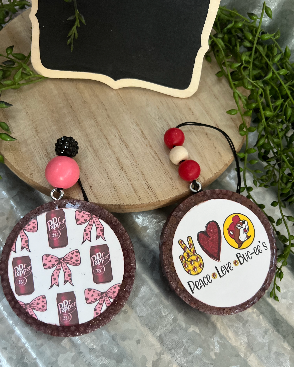 These fun, customizable air fresheners let you pick your favorite designs and fragrances, making every room or ride uniquely yours. All of our Freshies last up to 3-5 months depending on the season! The pictures below are examples of freshies that we have previously made. If you'd like to have a custom freshie- leave the theme for the picture such as favorite artist or favorite drink or what you'd like to have the picture as.(if you have a photo already picked out, you can send that to us via email or via our Facebook page!) Then add the scent that you'd like and if you're not sure, you can leave the type of scent your looking for such as- fruity, masculine, or freshness and we will take care of the rest!